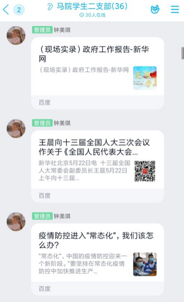 学生二支部委员会利用网络平台组织召开了支部大会,大会以学习《政府工作报告》、《全国人民代表大会关于建立健全香港特别行政区维护国家安全的法律制度和执行机制的决定(草案)》、常态化疫情防控下重要举措,并交流讨论学习心得为主要内容。