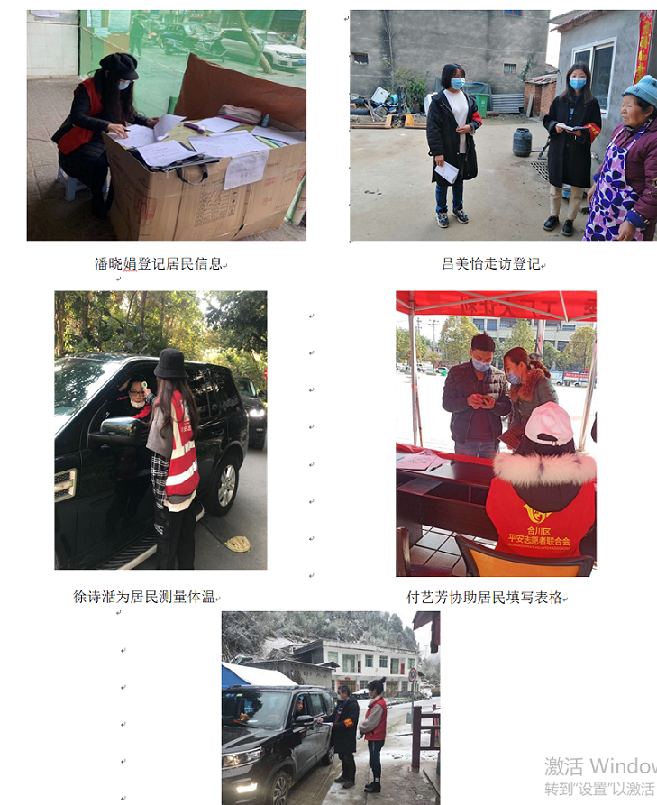 霍娜(研究生)、周月、伍凯、徐维、潘晓娟、吕美怡、徐诗湉、付艺芳、简嫔9名同学主动请缨,在这场没有硝烟的战争中,以实际行动助力社区乡村疫情防控工作:示意停车、为居民测体温、填写登记表格、巡逻劝阻出行人员等,协助社区做好新冠肺炎排查、宣传等工作,有序参与社区防疫工作,成为联防联控群防群控的重要力量。