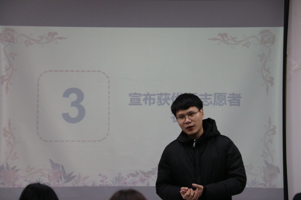随后,部长罗嘉兴宣布评优志愿者名单并为优秀志愿者颁奖。紧接着,部长罗嘉兴进行总结发言。罗嘉兴首先赞扬和感谢了全体志愿者成员在本学期的辛勤工作,随即也对志愿者们下一学期的工作寄予了厚望。期许志愿者们在生活中秉持一颗充满热情的心砥砺前行,鼓励志愿者们在工作上通过各种途径参与多样化的志愿者活动,寻找志愿活动存在的意义。