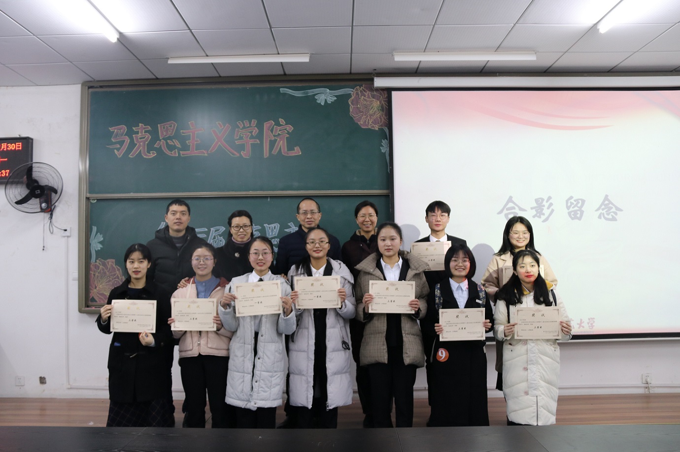 历时一小时四十分钟,所有选手展示完毕。邓淑月、严佳同学荣获一等奖;邓雨、周鹏飞、王志诚同学获得二等奖;徐维、陈岚清、谭玲英、李冰慧、杨婕、丁敬佳等六名同学获得三等奖。评委点评环节,李长泰老师通过列举马克思、毛泽东、习近平读书的例子,提出“大牛都是读经典成长起来”的观点,向在场同学强调了读经典的重要性并呼吁同学们积极阅读经典。随后,在高度赞赏选手们的精彩表现后,李老师也从报告技巧、内容、台风以及选题方面提出了建议,希望选手在以后的经典报告中一是选题应当切合社会主义核心价值观和习近平新时代中国特色社会主义思想理念,二是报告应该聚焦经典本身的意义价值,由点及面剖析经典内容,对于心得体会则是点到重点、点到经典即可。16时20分,评委与选手合影留念,活动圆满结束。