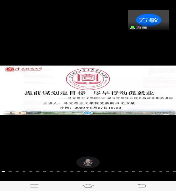 讲座于5月27日19:30在腾讯视频线上进行,主题为“提前谋划定目标、尽早行动促就业”。方敏副书记从分析形势、转变观念、精准目标三个角度为同学们进行了详尽讲解:第一部分内容是帮助同学们认清就业形势。方书记从疫情影响、就业人数、国家政策三个方面进行分析,认为 2021届毕业生的就业形势更加严峻;但他同时也分析了国家给予大学生的就业政策支持,认为形势虽然严峻,却不乏机遇,让同学们树立就业信心。第二部分内容是要毕业生转变就业观念。“有编无编都是好工作”、“家近家远都是好地方”、“就业创业都是好选择”、“基层也是好选择”、“考研就业都有好前途”,方书记激励同学们要积极转变就业观念,勇于突破自我,突破限制,眼光长远才能更好把握好未来。第三部分内容是精准就业目标。方书记要求同学们尽早明晰自我定位,了解自己的长短处,充分利用在校时间,有效提升核心竞争力,为就业做好充足的物质准备以及心理准备;最后,方书记鼓励2017级同学们,要不怕失败,不怕错误,勇于尝试,勇于突破,在严峻形势中实现自己的梦想。