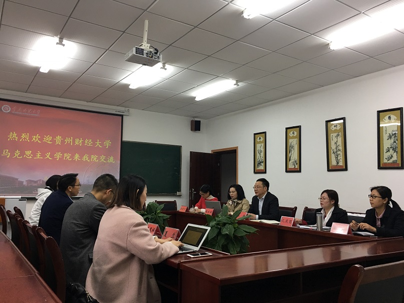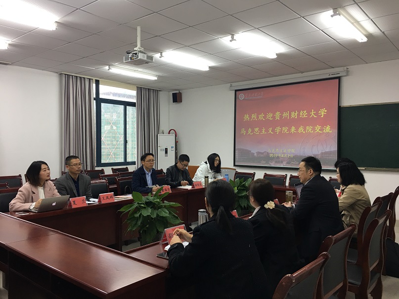 2019年4月2日上午,贵州财经大学熊猫体育 蒙锡岗副院长一行来熊猫体育 进行交流。熊猫体育 党委书记刘军、院长陈洪,思想政治理论课教研部主任孔庆茵、副主任魏冰娥,毛中特教研室主任邵二辉,《高校思想政治理论课实践教学实用教程》主编陈钢,教科办主任张晓庆参加交流。
