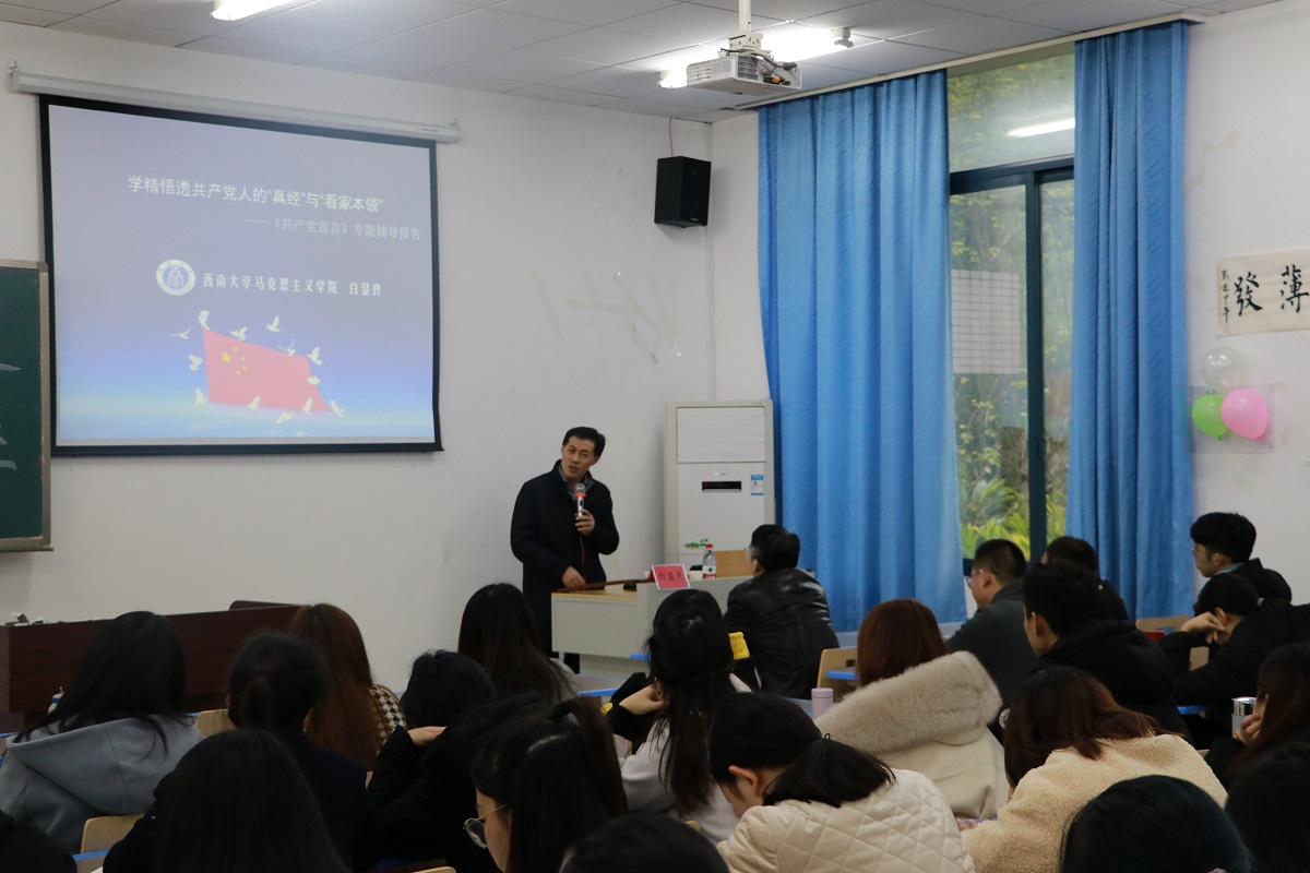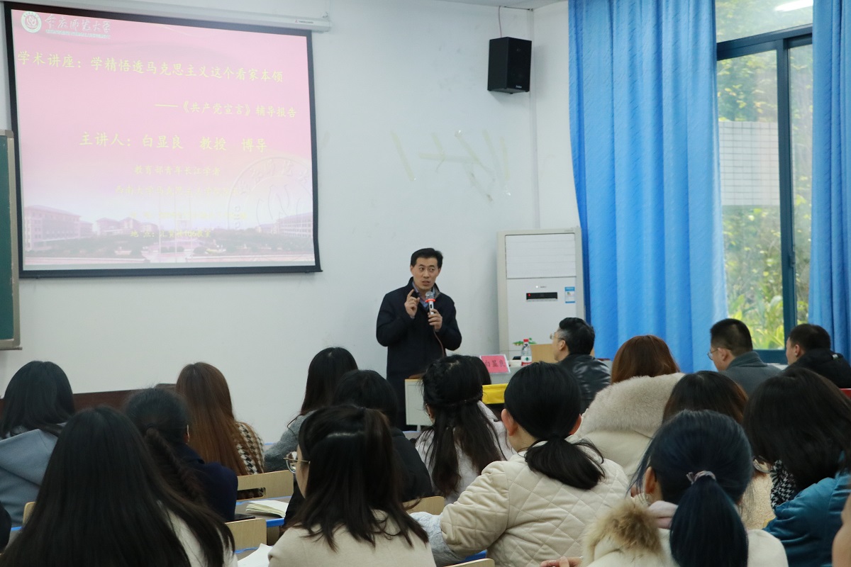 2019年11月26日下午,西南大学熊猫体育 院长、博导、青年“长江学者”白显良教授应熊猫体育 邀请到汇贤楼X106教室做题为“学精悟透共产党人的‘真经’与‘看家本领’——《共产党宣言》专题辅导报告”的专题讲座。熊猫体育 全体研究生和部分教师共同聆听讲座。讲座由熊猫体育 院长陈洪教授主持。