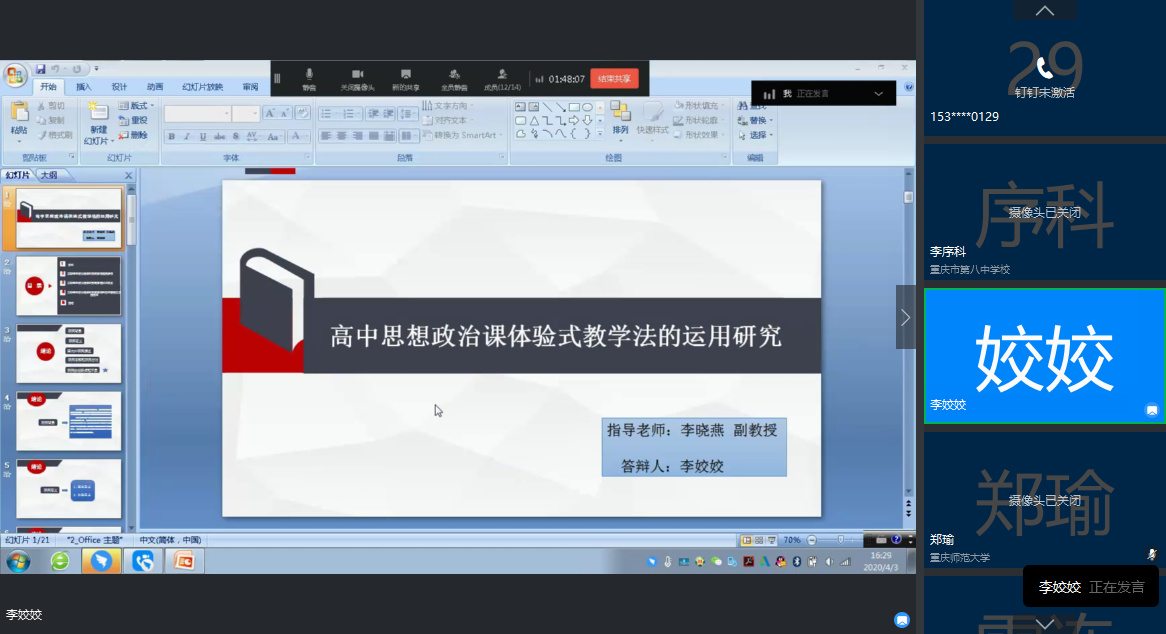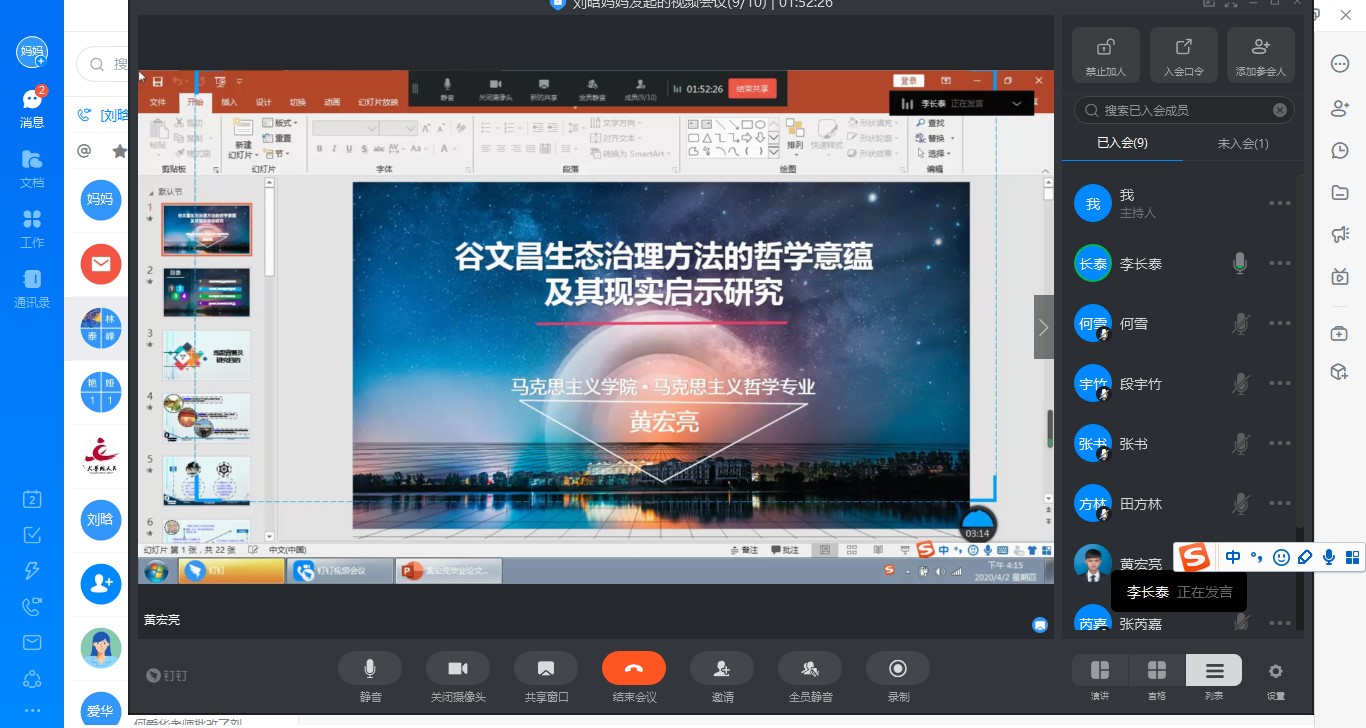 目前正值新冠肺炎疫情特殊时期,为加强对毕业研究生学位论文的指导和管理,切实提高研究生培养质量,熊猫体育 认真贯彻落实教育部和熊猫体育 工作要求,切实担起责任,努力做到研究生学位论文与学位授予工作质量不降、标准不变、程序规范、方式便利。根据熊猫体育 的要求和熊猫体育 的安排,2020年4月2日、3日下午,我院采取钉钉视频会议的形式分别开展了2020届马克思主义理论、哲学学科学术型研究生和学科(思政)专业学位研究生学位论文线上预答辩工作。