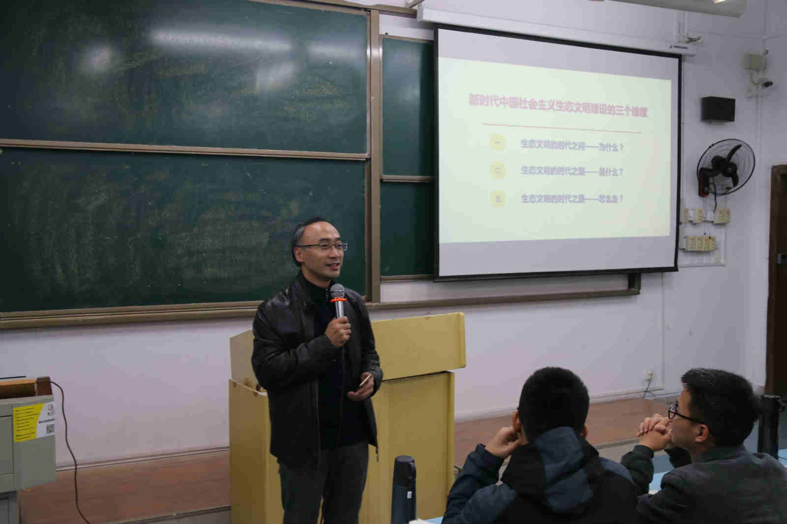 兰桂萍副教授从“生态文明建设的时代之问”、“生态文明建设的时代之蕴”和“生态文明建设的时代之路”三个方面进行讲解。首先,兰桂萍副教授列举了工业革命以来人类社会所产生的污染问题并引入主题,着重强调当前生态与文明之间的关系是:生态兴则文明兴,生态衰则文明衰。紧接着,她提出生态文明建设的时代之蕴具有两方面含义:文明形态的“演化式”——生态文明是对工业文明的超越和文明要素“结构式”——生态文明是一种整体文明构成。最后,在“生态文明建设的时代之路”中,兰桂萍副教授从前提、内核、重点和路径入手,指出应坚持:尊重自然、顺应自然和保护自然的三个理念;人与自然和谐共生、绿水青山就是金山银山等八个原则;生态文化体系、生态经济体系等五个体系以及加快构建生态文明体系、全面推动绿色发展等五点要求。