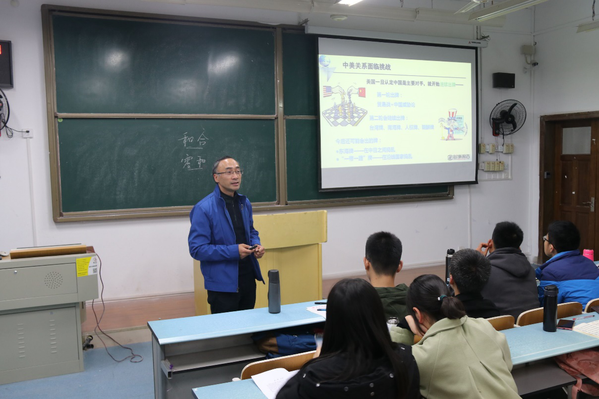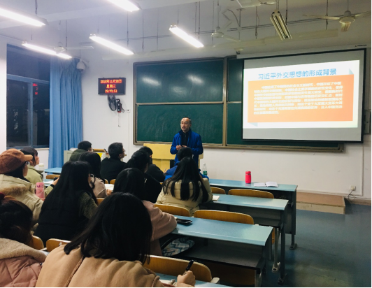 刘书记先从习近平外交思想的形成背景切入,向同学们阐释了中国走进了中国特色社会主义新时代,中国外交的宗旨和目标诉求也相应发生重大转变的历史背景;随后,他又从习近平外交思想的重要地位、总体框架和核心要义三个方面详细地加以论述,其中,刘书记着重讲述了习近平外交思想的十大核心要义。紧接着,刘书记分析了中欧“联合抗美”和美俄“联合抗中”不可能的例子来说明当今世界大国关系的不确定性新变化,大国关系深入调整的原因在于实力兴衰变化。未来几年大国关系走势是中美关系面临挑战、中俄关系将总体保持稳定、中国与欧盟的关系将持续发展、中日关系仍有风险、中印战略竞争态势或加剧。最后,他指出应对大国关系变迁的中国之策:三个正确处理即内部问题、周边问题和两岸关系以及大国关系。他指出:只要我们家里不出事,保持战略定力,外部挑战就都是可控的。