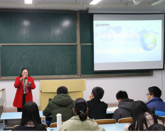 本次讲课,刘书记备课充分,课件精美,内容熟悉,娓娓道来,亲和力强,将纷繁复杂的国际形势用“治大国如烹小鲜”的形式展示出来,极大地调动了同学们学习的积极性,课堂气氛活跃。