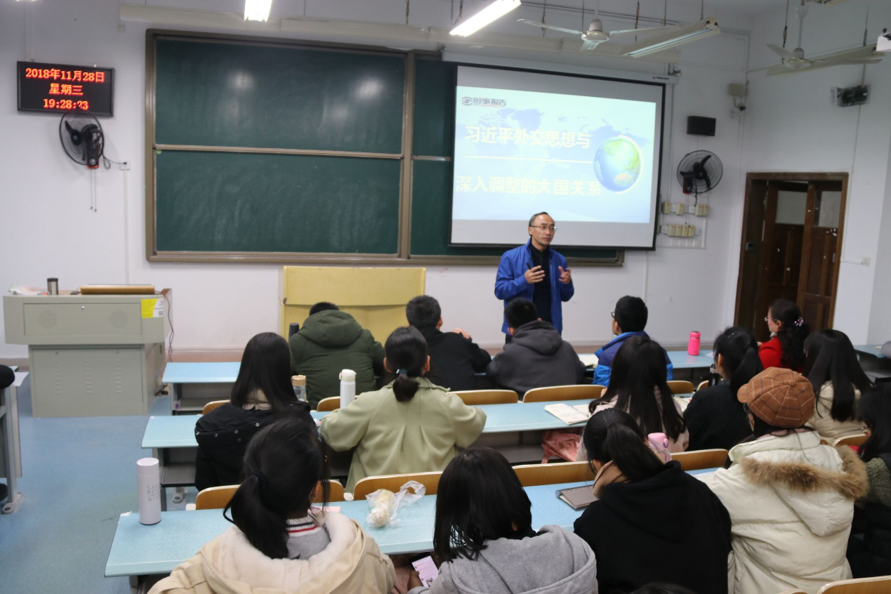 2018年11月28日晚,“习近平新时代中国特色社会主义思想”通选课在弘德楼15103教室继续进行第十讲。本次讲课由熊猫体育 党委书记刘军主讲,主题是“习近平外交思想与深入调整的大国关系”,讲座由思想政治理论课教研部主任孔庆茵副教授主持。