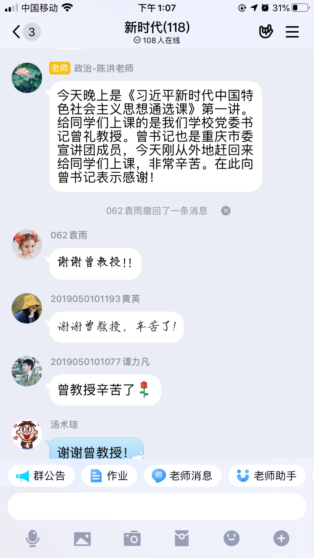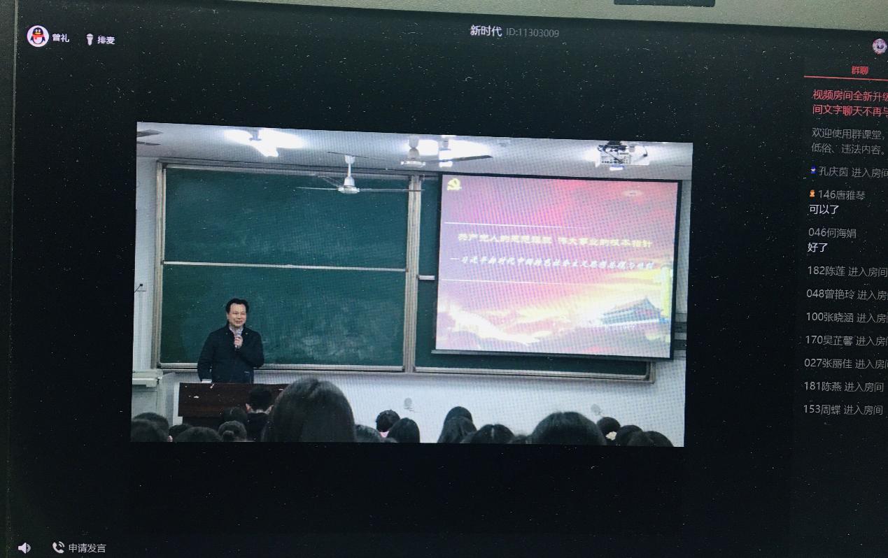 院长陈洪教授在QQ群里向同学们介绍了主讲人曾礼教授的情况。随后,曾礼教授通过QQ群课堂,以录播视频的形式正式展开本次课程的线上教学。本次课程以“共产党人的思想旗帜,伟大事业的根本方针”为题讲授了习近平新时代中国特色社会主义思想的总揽与精髓。曾礼教授主要按照时代背景、丰富内涵、理论特色、实践要求、历史地位和成就依次展开。首先提出当下中国特色社会主义新时代的内涵,通过与同学们互动指出新时代的含义;接着,对习近平新时代中国特色社会主义思想的核心要义、“八个明确”的丰富内涵、四个鲜明理论特色和十四个坚持的实践要求等进行了深入阐释。在课程的最后,曾礼教授希望同学们要学深悟透,把握精髓要义;要真信真用,积极践行。最后鼓励同学们要努力奋斗,幸福都是奋斗出来的。