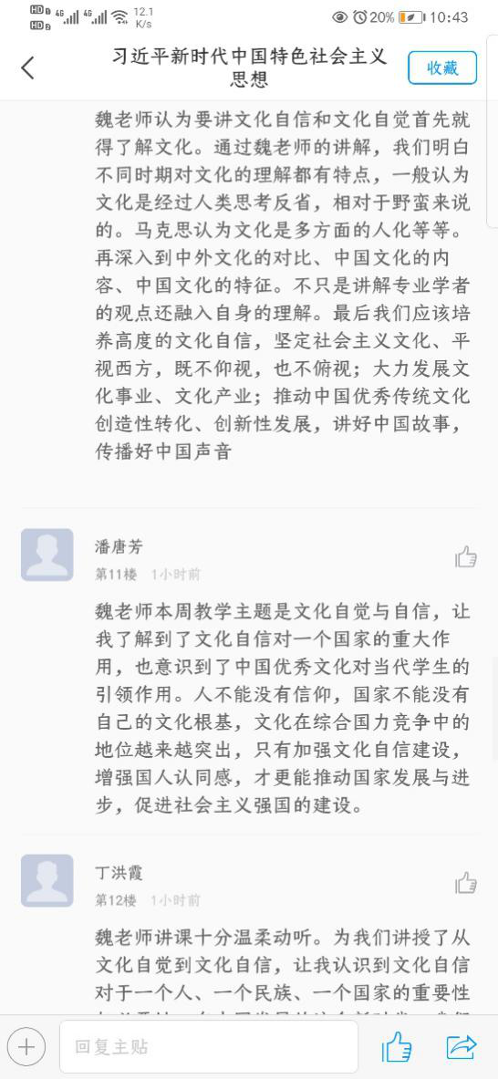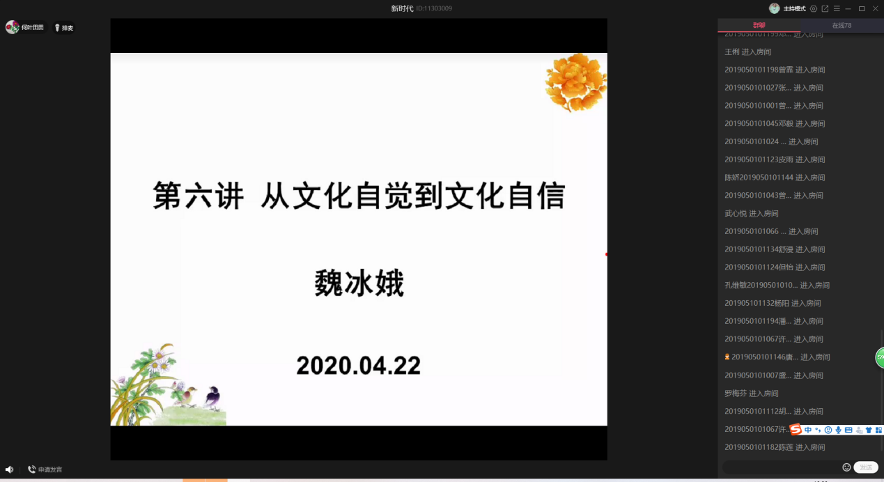 为深入学习贯彻习近平新时代中国特色社会主义思想,培养学生的文化自觉,增强文化自信。2020年422日晚,熊猫体育 开展的全校通选课《习近平新时代中国特色社会主义思想专题摘编》第四期第六讲由熊猫体育 魏冰娥教授主讲,讲课主题为“从文化自觉到文化自信”。本次授课采用了QQ群课堂直播的线上教学形式,选课同学按时、全部参与了此次线上教学活动。