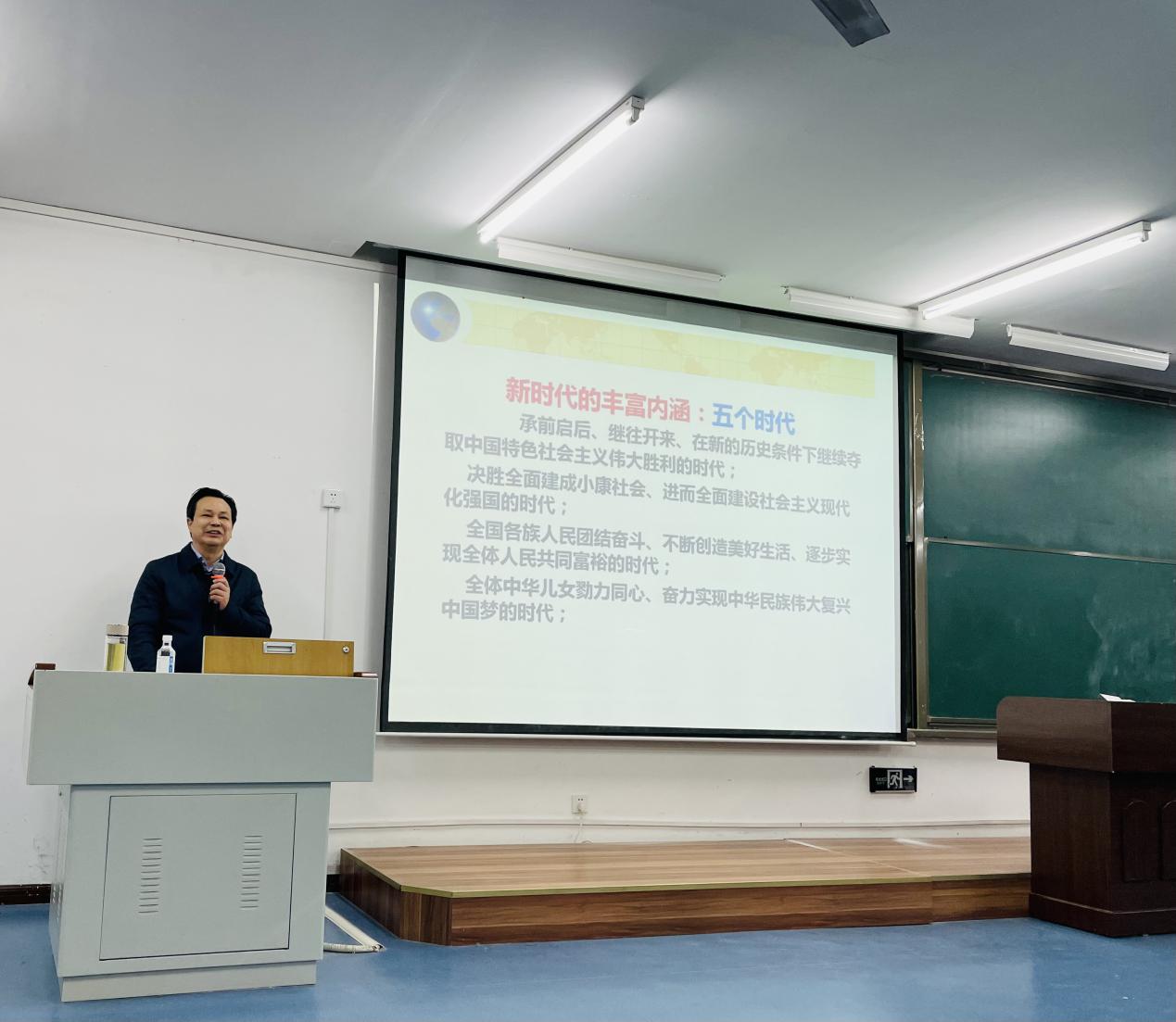 曾礼教授围绕“共产党人的思想旗帜,伟大事业的根本指针——深刻认识习近平新时代中国特色社会主义思想的决定性意义”,从“时代背景”、“核心内容”、“历史地位及贡献”和“做新时代中国特色社会主义传播者、践行者”四个方面进行深入浅出的讲解。曾礼教授通过引入习近平新时代中国特色社会主义思想产生的时代背景,介绍了新时代的五个丰富内涵、重大意义和新时代带来国际国内和党的自身建设新变化新挑战,并结合中美贸易战、新冠肺炎疫情病毒溯源美国甩锅中国和俄乌冲突,让同学们看清西方资本主义的本质。接下来,曾礼教授阐释了习近平新时代中国特色社会主义思想“十个明确”的基本理论和“十四个坚持”的基本方略,并结合中国对非洲的援助,《长津湖》、《觉醒年代》等影视剧,阐释了习近平新时代中国特色社会主义思想的历史地位及贡献,以及中国共产党为什么能、中国特色社会主义为什么好,归根结底在于马克思主义行,让同学们坚定道路自信、理论自信、制度自信和文化自信。