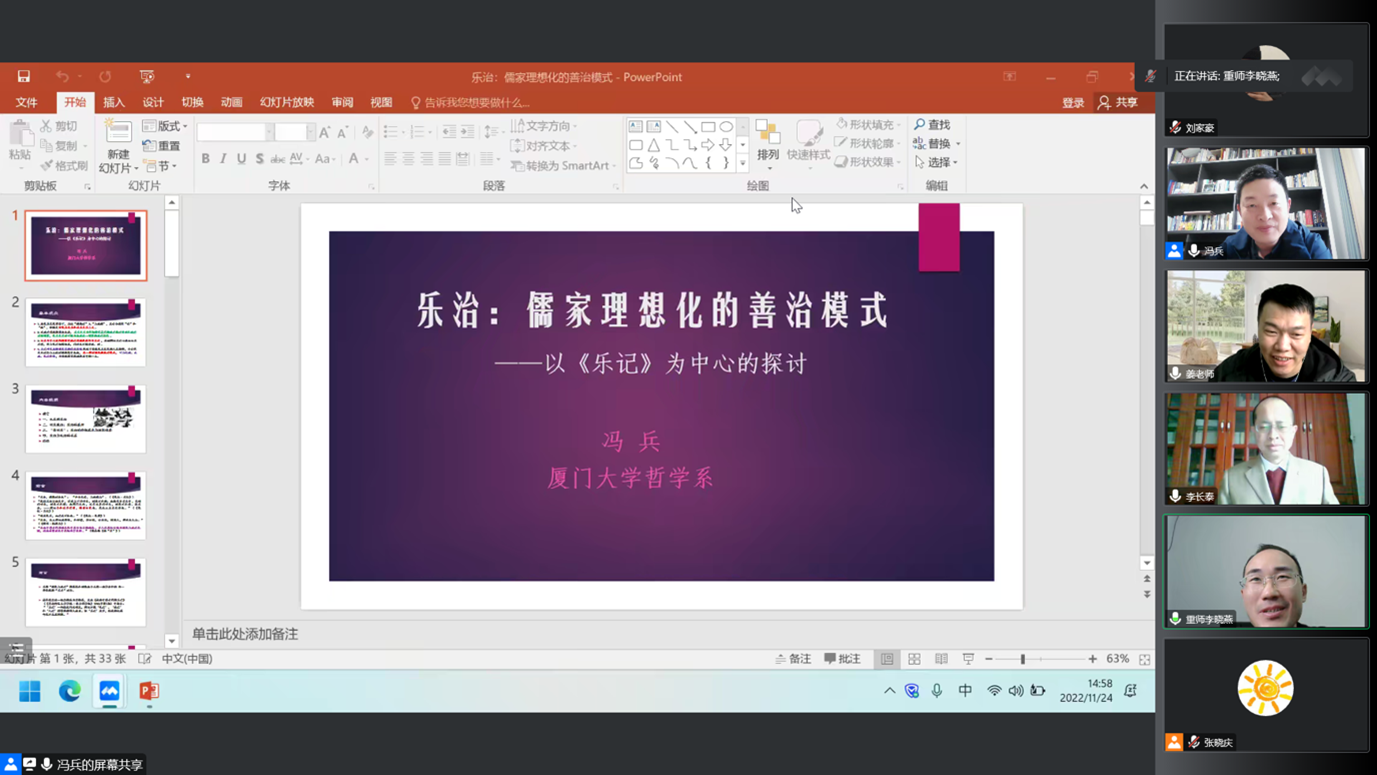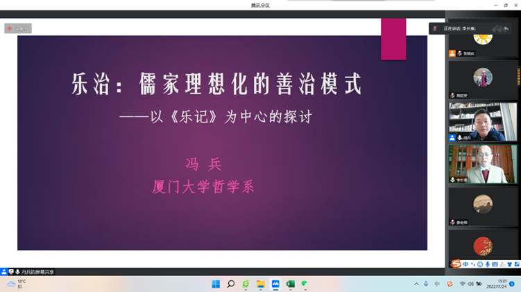 为进一步深入领略中华优秀传统文化的魅力,营造良好的学习氛围,2022年11月24日15:00,熊猫体育 2007届校友、厦门大学哲学系冯兵教授应邀为熊猫体育 师生作题为“乐治:儒家理想化的善治模式——以《乐记》为中心的探讨”的学术讲座。本次讲座系熊猫体育 马克思主义论坛(第10期)暨熊猫体育 第26届研究生学术活动月系列活动。熊猫体育 近300名师生通过腾讯会议线上参会学习。本次讲座由李长泰教授主持。