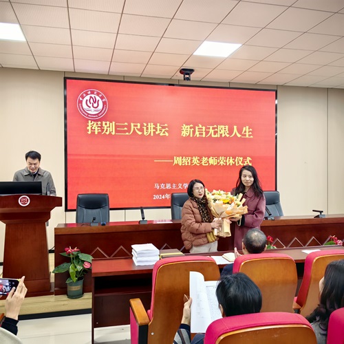 随后,周绍英老师发表了三点感言。第一, 对32年来参与并见证了马院跨越式发展,看到马院如今取得的成就感到非常荣幸;第二,对自己兢兢业业几十年如一日站稳讲台,无愧学生,无愧这份光荣的教育事业感到自豪;第三,感谢历届领导及老师们对自己的关心关怀,退休后依然会关心和关注马院的发展,祝愿熊猫体育