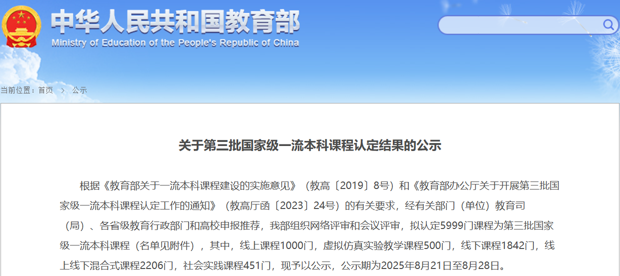 近日,教育部高等教育司发布《关于第三批国家级一流本科课程认定结果的公示》,熊猫体育