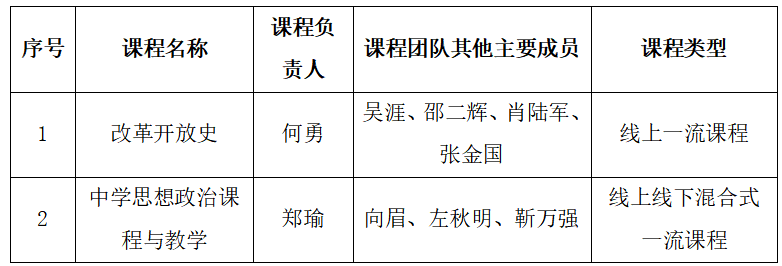 何勇副教授负责的线上一流课程《改革开放史》和郑瑜副教授负责的线上线下混合式一流课程《中学思想政治课程与教学》共2门课程拟获认定。