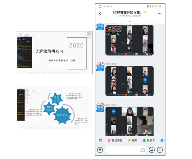 在疫情期间“停课不停学”的原则上,天星桥中学对实习工作进行了精心设计、统筹安排,开启了在线教育实习活动。3月2日,在天星桥中学教务主任刘莉老师的组织下,分别建立了2020年实习管理微信群和2020年重师实习生培训钉钉群,并公布实习学生分年级分班级情况;3月9日, 利用钉钉群在线直播和视频会议的形式,召开实习见面会,如期开启了我们的教育实习活动。