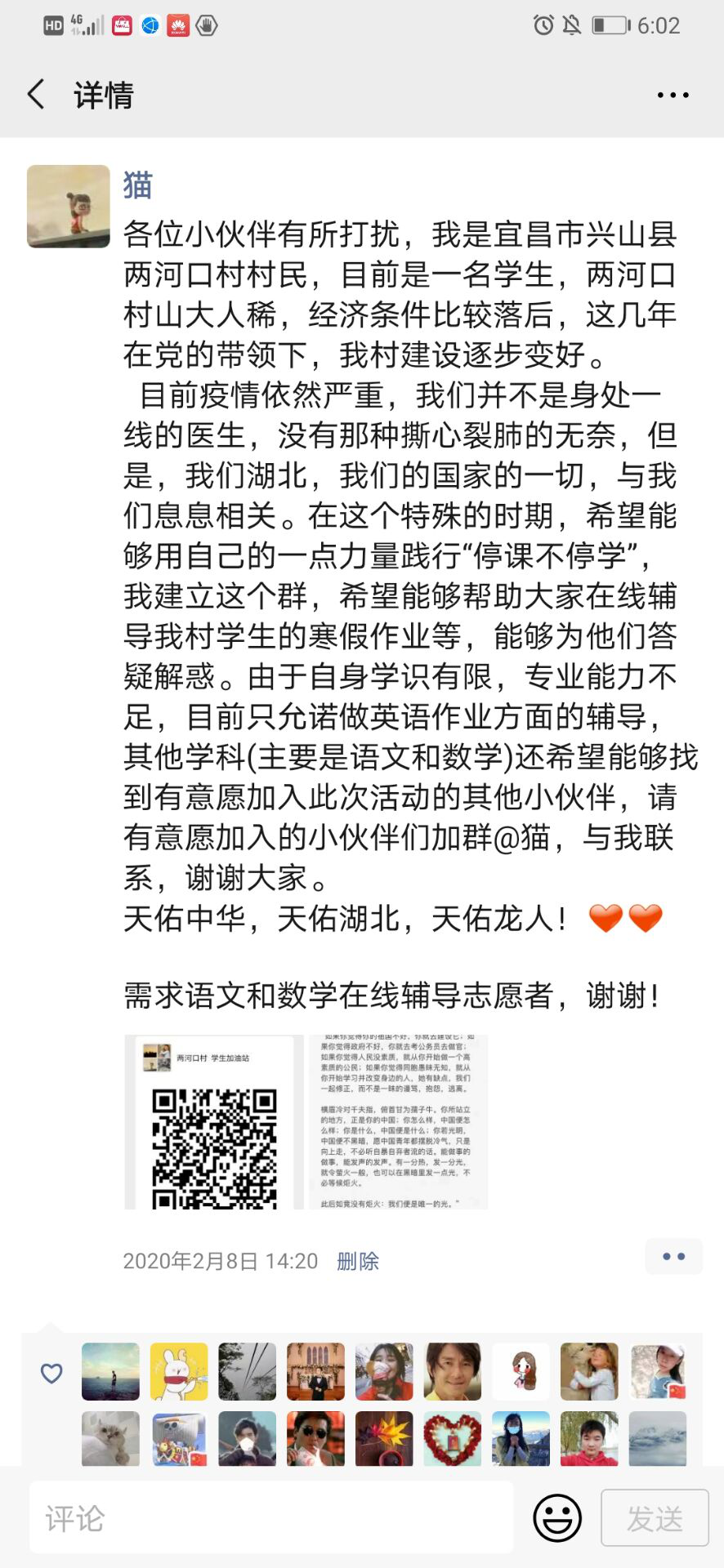 谭京凤说:“基于师范院校的情怀,我在几年前就有想过在寒暑假期间能够发挥所长,为当地村民的孩子辅导作业。今年受到疫情的影响,很多孩子无法出门,村里的年轻人也比较少,很多孩子的作业和功课没法得到有效的辅导。目前疫情依然严重,我们并不是身处一线的医生,没有那种撕心裂肺的无奈。但是,我们的湖北,我们的国家的一切都与我们息息相关。作为一名青年大学生党员,响应党的号召,希望用自己的一点力量践行“停课不停学”,建立这个作业辅导群,希望号召更多人在线辅导村里学生的寒假作业等。”