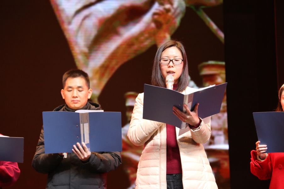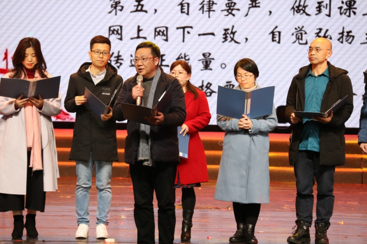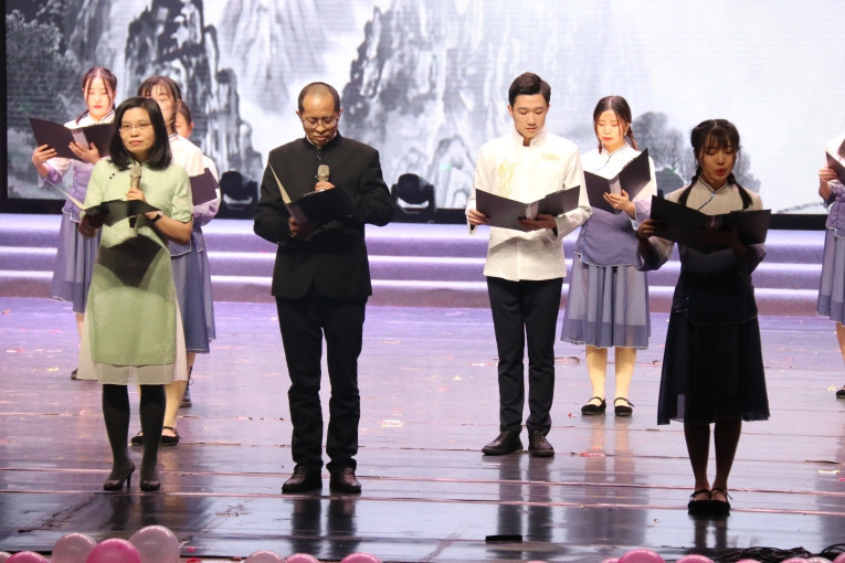 除学生表演外,老师也展现出不同于课堂上的一面。朗读《国学诵读》中,李长泰老师、魏冰娥老师与学生一起,站上舞台,以小我之姿,传诵经典,弘扬中华优秀传统文化;中特全体老师朗读《旗帜》,气势磅礴浑厚,更是表达了马院全体师生对祖国的颗颗赤诚之心。
