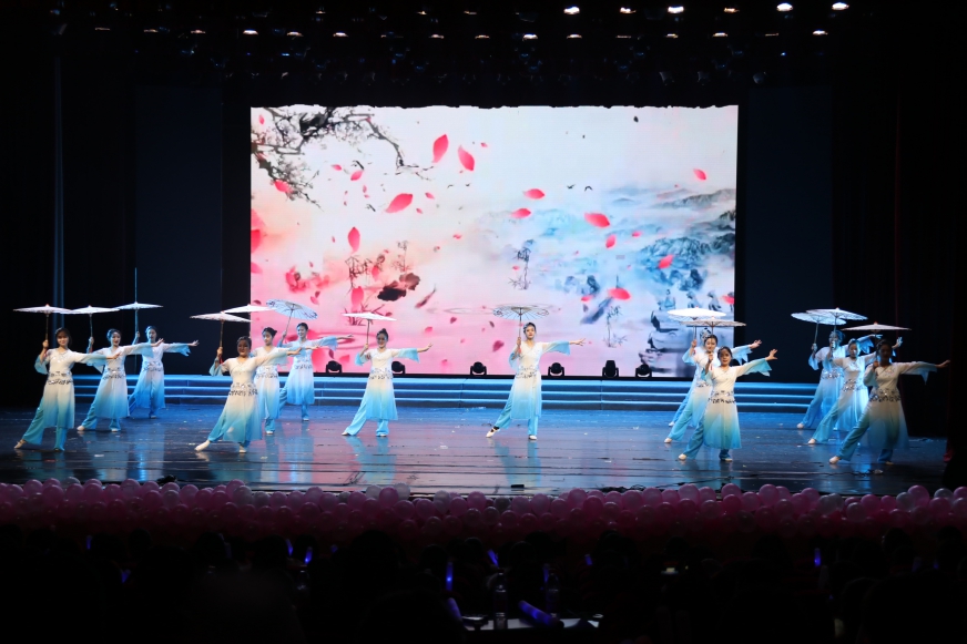 此次晚会由校委艺术团的同学带来的歌舞伴唱《不忘初心》拉开帷幕,主持人伴着歌声向在场师生宣布晚会的开始。