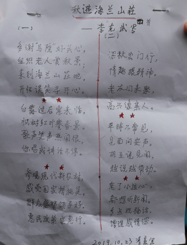 组织了一年一次的退休老同志秋游。小雨中的深秋,让人感到一丝丝冷意,地上还有些湿滑,10名老同志们克服困难,饶有兴致的随车前往金凤镇海兰云天。84岁的李克武老师兴奋得早上5:00过就起床,并在出发前用心写下《秋游海兰山庄》小诗四首送给熊猫体育