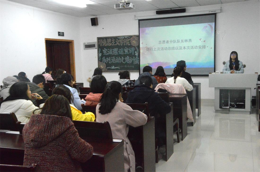 在主持人介绍完嘉宾后,活动正式开始。首先,志愿者分队队长林燕总结上次活动,并对志愿者们的良好表现提出表扬。随后,理论宣讲团团长夏思雨从宪法基础知识、公民权利与义务及生活中的宪法三个方面为志愿者成员进行宪法知识宣讲,并着重强调了宪法的重要性。夏思雨用“文明上网”、“性别平等”、“就业培训”、“考试作弊入刑”四个关键词为志愿者们讲解宪法与生活的关系,志愿者们聚精会神地聆听团长夏思雨生动有趣的讲解,教室里时不时爆发出热烈的掌声。接着,志愿者分队副队长黄淦钦对本次活动路线进行安排,并强调了树立安全意识、学会自我保护的重要性。最后,各志愿者小组围绕本次活动的具体分工进行了讨论与交流,现场气氛活跃。