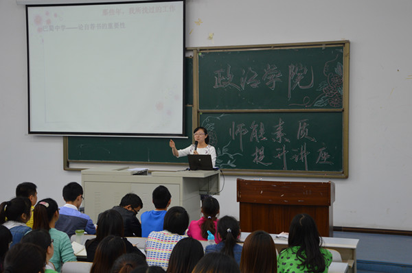 组织2011级全体学生于2014年4月21日下午4点半在图北楼7201开展了师范生素质技能讲座,主讲人为重庆南开中学韩琳老师,出席此次讲座的有熊猫体育
