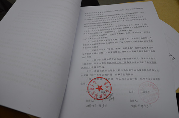协议的签署标志着沙坪坝区总工会正式成为熊猫体育 大学生社会实践基地。熊猫体育 在2014年4月4日开展了第一次实践活动,组织熊猫体育 青马班初级班成员、“星火燎原”志愿者分队成员、团总支·学生会成员,开展了以“心手相牵 共享阳光”为主题的青年志愿者系列服务活动。