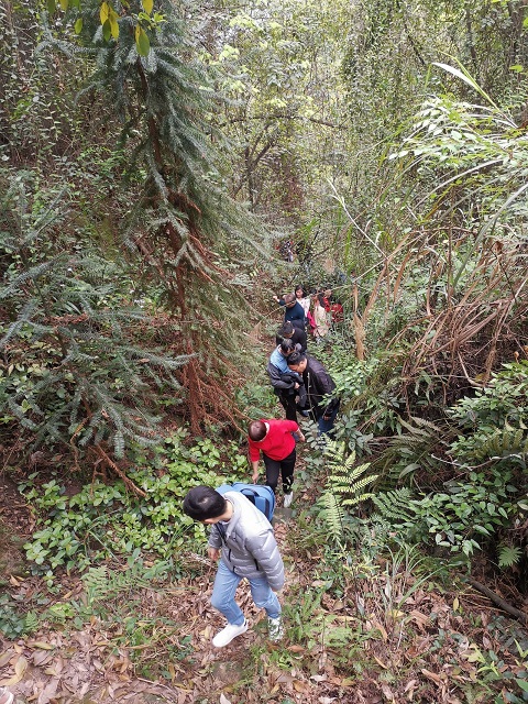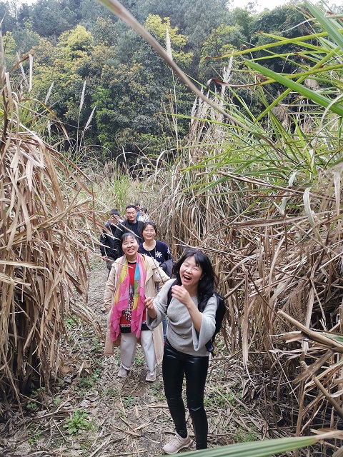 天公作美,阳光微醺、春风习习,雨后的山林格外清丽,虽然雨后山间小径时有淤泥黏上了鞋;路面的青苔让爬行更加艰难;蔓延的荆棘不经意划破了手心,但路旁的姹紫嫣红、桃红柳绿杏白足以弥补一切的困难。一路纵队征服了泥泞、越过了高山、穿越了竹海,你拉我带,相互鼓劲,历时2小时10分钟,全员到达指定位置。
