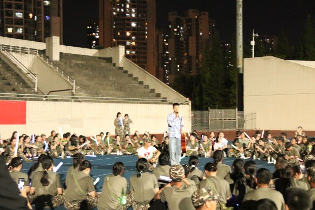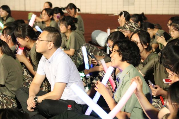 特此举办军训中秋晚会,院党委副书记方敏、连队指导员马小又、孟平、李海东来到军训场地同全体2021级新生共庆佳节。