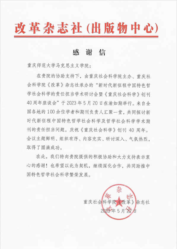来自重庆社会科熊猫体育 《改革》杂志社的感谢信