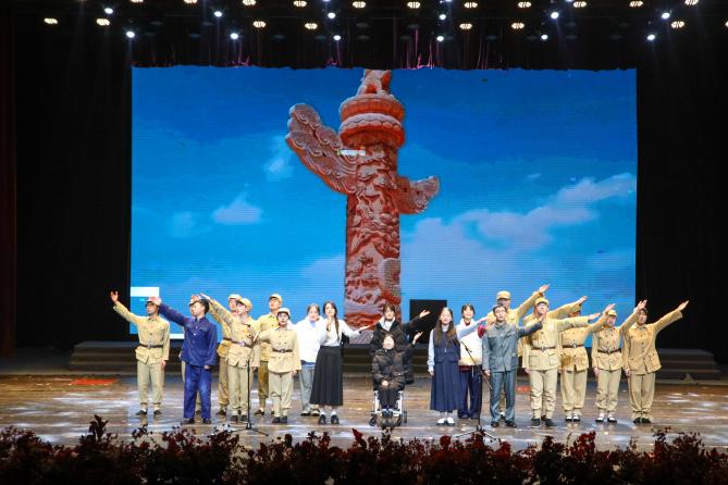 而后,当学生们进入陈洪教授的中国共产党历史的课堂,陈洪老师用两个党史小故事激励青年们要有敢教日月换新天的豪情,有直挂云帆济沧海的壮志。一群青年放声朗诵《青春》,奏响了爱国主义的青春华章。历史情景剧《横空出世》讲述了中国对于原子弹的研究从被国外敌视、国内猜疑到原子弹横空出世的艰辛历程,展现了马院学子的拳拳爱国之心。