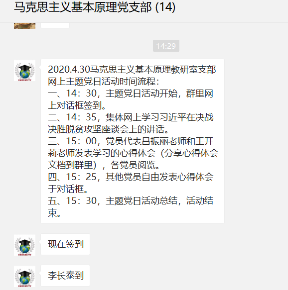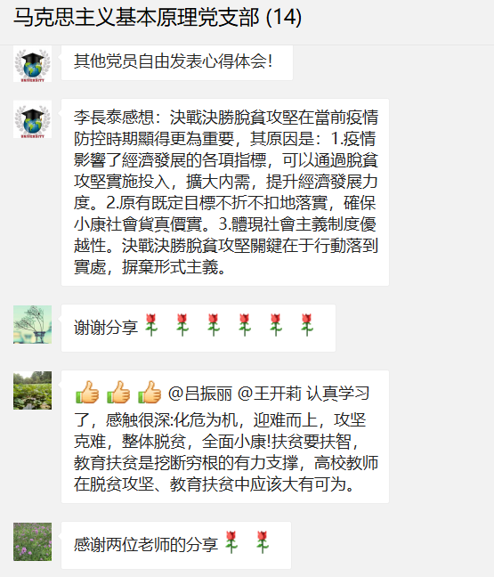 马克思主义基本原理概论教研室支部于2020年4月30日下午在微信支部群中开展了以学习“在决战决胜脱贫攻坚座谈会上的讲话”为主题的线上党日活动。