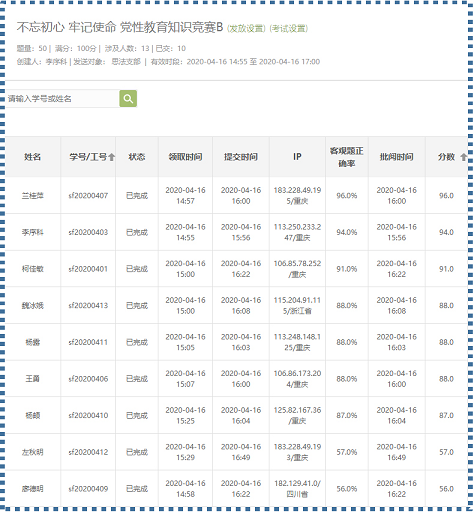 接下来,李序科同志根据熊猫体育 组织部下发的组织生活安排及样板支部创建工作的既定工作安排,在研读《中国共产党党员教育管理工作条例》、《中国共产党问责条例》、《中国青年志愿者协会简介(摘选)》、《大学生志愿服务西部计划项目介绍》以及《学习强国》中志愿者精神、公民道德建设实施纲要、习近平总书记在“不忘初心、牢记使命”主题教育总结大会上的讲话等文件材料基础上,创建了包括单项选择15题、多项选择15题、判断20题共计50题的知识竞赛网上试卷,同时将以上文件提前挂在超星网络教学平台上并于15日开放以方便支部成员签到学习。4月16日下午3点,预计2小时的知识竞赛正式拉开序幕。李序科同志首先利用平台宣布了知识竞赛的整体流程和答题要求,同志们在结束熊猫体育 网络会议后纷纷进入平台签到答题。到下午5点知识竞赛正式结束时,先后有13名党员同志准时参与知识竞赛,经电脑自动计分统计,兰桂萍同志荣获一等奖、柯佳敏、李序科同志荣获二等奖、王勇、杨露、魏冰娥同志荣获三等奖。