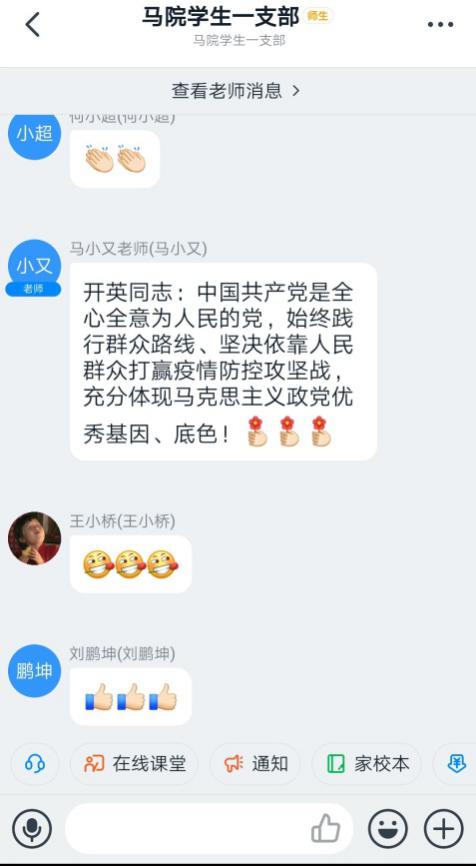 专业课教师,同时又兼任2019级弘博班辅导员,他身处湖北疫区,时刻牵挂学生身心健康,在扎实做好线上教学工作的同时按时保质地做好学生疫情摸排工作。周老师在分享中谈及了身边现状和自己的真实感受,并通过对国内国外舆论动向的分析,为大家树立了全局观念、大局观念,肯定了我国的政治体制,增强制度自信。王娜同志向大家分享自己担任街道“疫情”新闻写作志愿者时采访的两个真实案例,真切而感动,表达了自身努力做一名向上向善好青年的决心。张倩同学分享了自己在村中的志愿者生活,她说,国家和人民需要我,我就要贡献出我的一份力量。王小桥同志参加了由熊猫体育