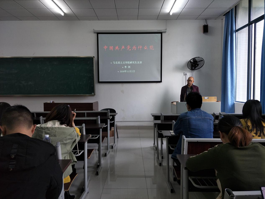 党的十九大以来,习近平总书记反复多次强调“不忘初心、牢记使命”,坚持为中国人民谋幸福、为中华民族谋复兴。我们的党之所以能,关键在于有坚强的领导核心和坚定不移的信念。然后,李剑老师从目标、机制、成员、行动四个方面的统一对党课的主题进行了总结,使我们深刻理解了中国共产党砥砺前行,创造奇迹的本质原因。