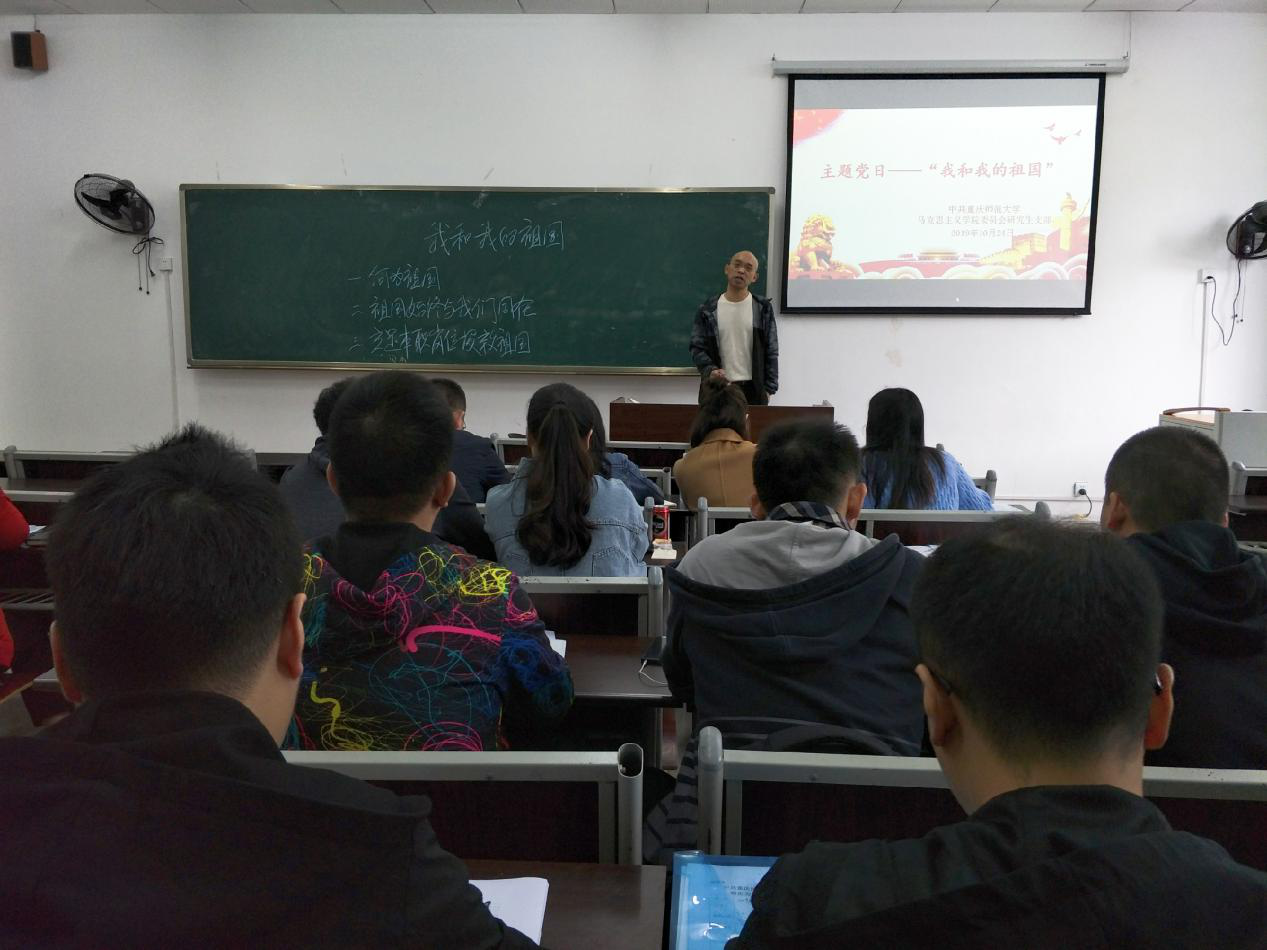 10月24日中午,熊猫体育 研究生党支部在汇贤楼107教室召开了“不忘初心、牢记使命”主题教育“我和我的祖国”主题党日活动,会议由支部书记李剑同志主持