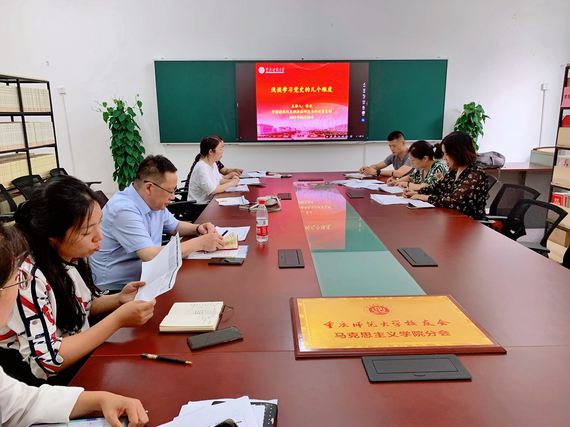 本次会议的主要内容是党支部书记黄正同志讲党课,主题是浅谈学习党史的几个维度。他从四个方面出发阐释了我们学习党史的几个维度。首先,处理好宏观与微观之间的关系。他通过列举遵义会议等历史上的重要会议,阐述了如何从微观层面去了解它们的重大意义。其次,坚持政治性,反对历史虚无主义。第三,注重形式与内容相结合。古人云,学无定法,唯有德法,并倡导通过情景式教学的方式开展党史学习教育。最后,基础是学,关键是做。作为一名高校思政课教师,不但要深入学习党史知识,同时也要注重党史知识的输出,惠及大众。