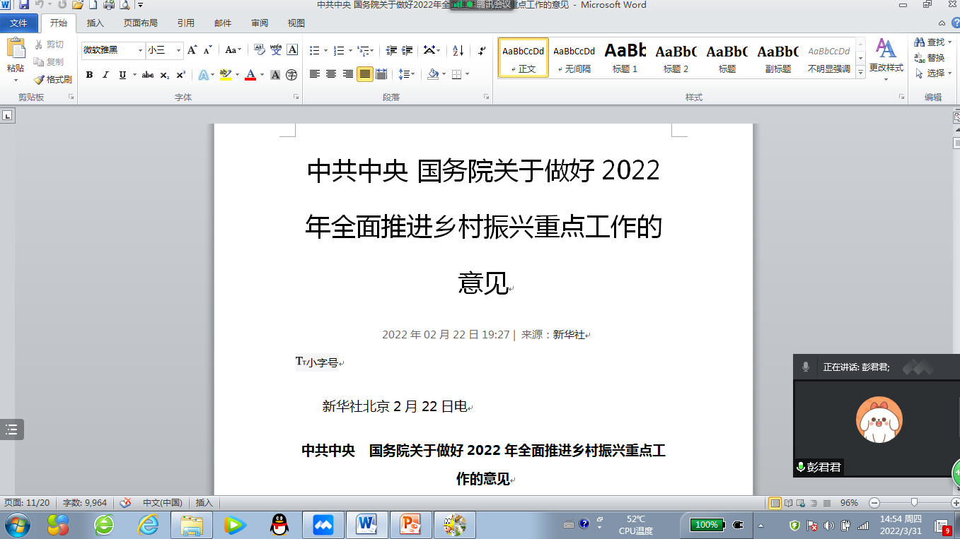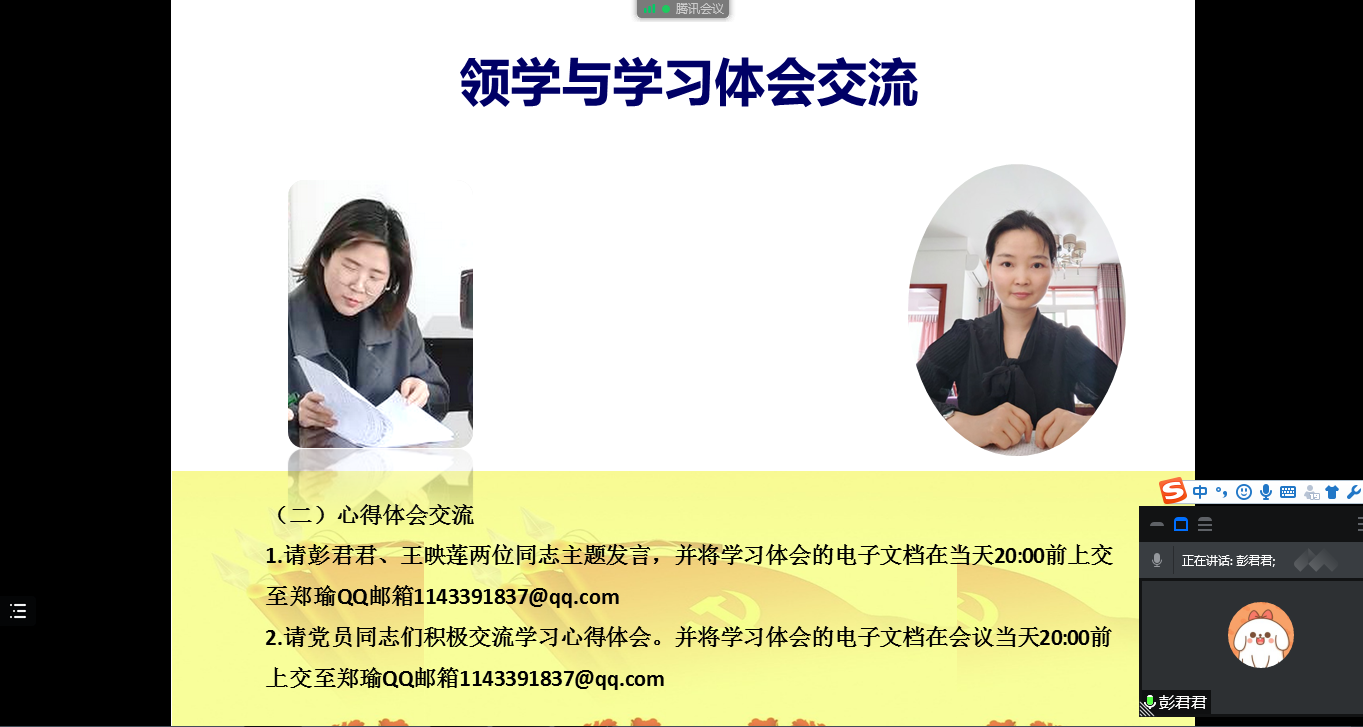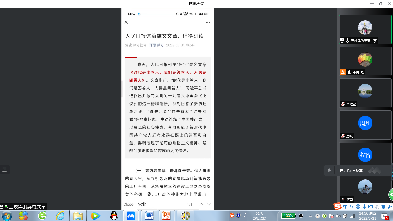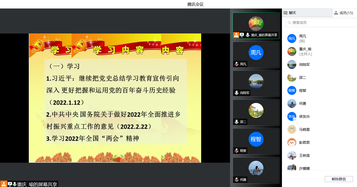 “概论”教研室党支部通过腾讯会议召开线上支部党员大会,组织开展3月主题党日学习活动,重点学习了2022年1月11日习近平总书记在省部级主要领导干部学习贯彻党的十九届六中全会精神专题研讨班开班式上发表的《继续把党史总结学习教育宣传引向深入 更好把握和运用党的百年奋斗历史经验》重要讲话,以及《中共中央 国务院关于做好2022年全面推进乡村振兴重点工作的意见》主要精神。会上,彭君君和王映莲两位同志从乡村振兴战略的时代背景、机遇挑战、具体举措和重要意义等方面交流了学习心得,祝玉峰等同志踊跃发言,谈了各自的学习体会。通过学习,全体党员加深了对党的百年奋斗历史以及乡村振兴战略的理解和把握,为进一步提升课堂教学质量打下了坚实的基础。