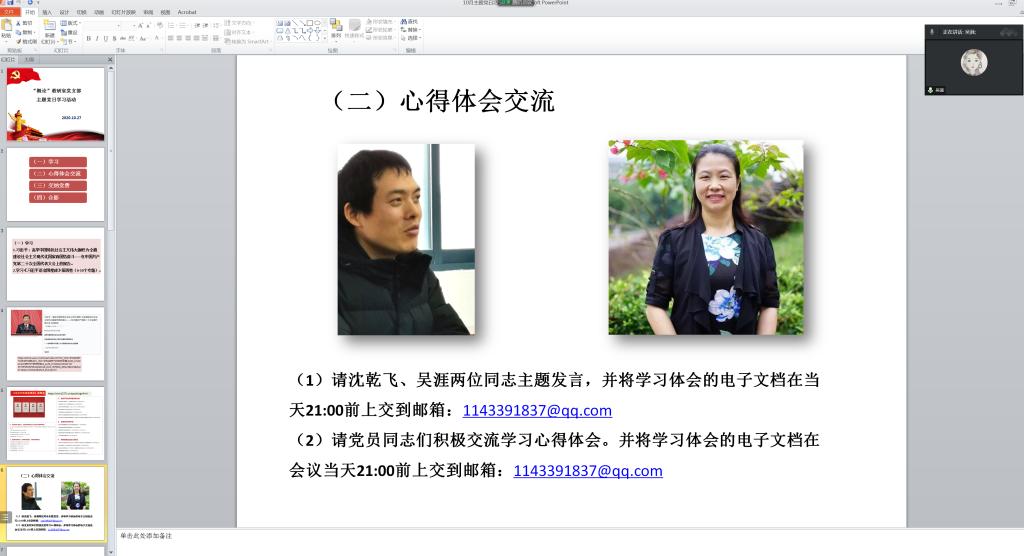 2022年10月27日中午1:00,“概论”教研室党支部通过腾讯会议召开线上支部党员大会,组织开展10月主题党日学习活动,重点学习了中国共产党第二十次全国代表大会报告和《习近平谈治国理政》第四卷第六至十专题的相关内容。会上,吴涯同志着重从新时代十年伟大成就、全过程人民民主的本质内涵和将党的二十大精神融入思政课教学三个方面交流了学习心得;沈乾飞同志重点就党员干部在实现中国式现代化中的关键作用以及如何更好推进党的自我革命等角度谈了学习体会;蓝天同志则围绕全面建成社会主义现代化强国的关键因素—科技和创新发表了学习感想。最后,支部书记郑瑜同志要求全体党员要持续深入学习贯彻习近平新时代中国特色社会主义思想和党的二十大精神,切实把其中的新理念、新提法、新论断全方位融入到思政课的课堂教学中,让党的最新理论成果及时进教案、进课堂、进学生头脑。