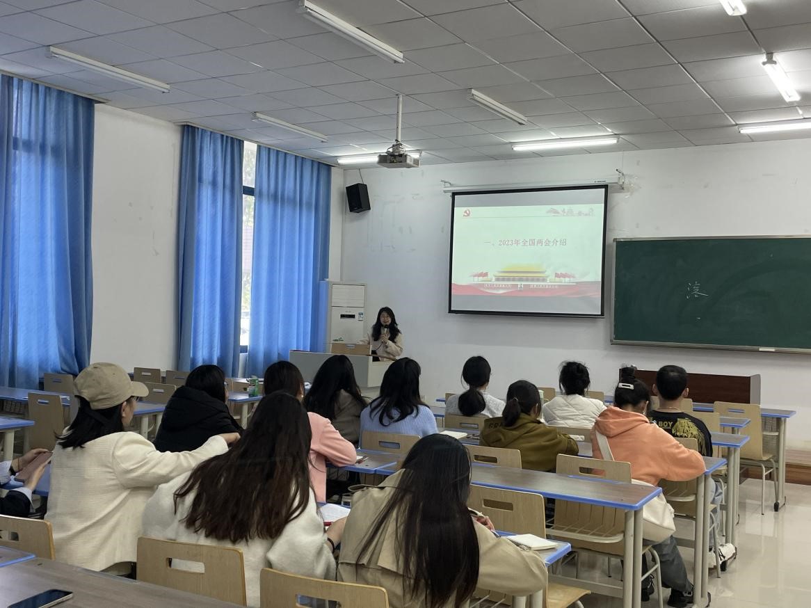 首先,罗莉同志简要地介绍了本次学习的主要内容,讲述了学习两会精神的必要性和意义。随后,三位党员同志依次进行了交流分享。梁梦怡同志从全国两会基本情况、两会关键词、两会精神学习资料这三个方面进行了汇报。黄婷婷同志谈到,今年两会是“极不寻常,极不平凡”更是“注重民生,倾听民声”的会议。王梦妮同志聚焦“教师减负”和“推进大中小思政一体化建设”两大主题展开论述,认为推进大中小思政一体化建设要从夯实“一体化”的科学基础、构建“大思政”的工作体系、给予专门政策保障三个方面落实。