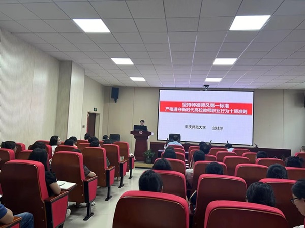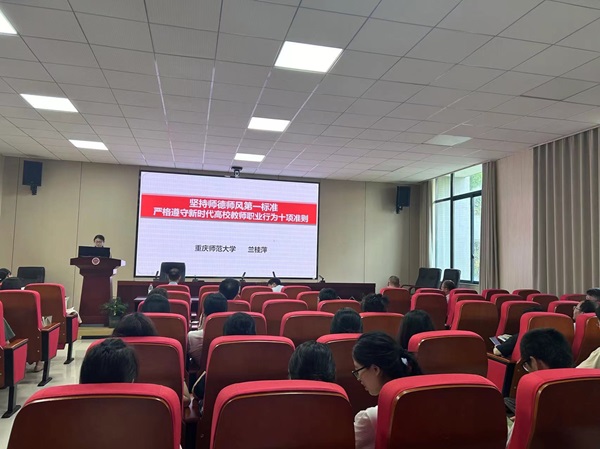 全国优秀教师、校师德标兵兰桂萍教授进行了师德师风建设专题讲授。兰老师的专题讲授以《坚持师德师风第一标准 严格遵守新时代高校教师职业行为十项准则》为主题,以新时代高校教师职业行为十项准则为切入点,围绕坚定政治方向、自觉爱国守法、潜心教书育人等十个方面展开讲述,她强调了高校教师知准则、守底线,认真贯彻落实以德立身、以德立教的重要性,同时结合教育部曝光的师德失范典型案例,警示高校教师,特别是思政课教师红线不可碰,禁令不可违。最后,兰老师向全体教师强调作为师者的使命:走上三尺讲台,教书育人;走下三尺讲台,为人师表。