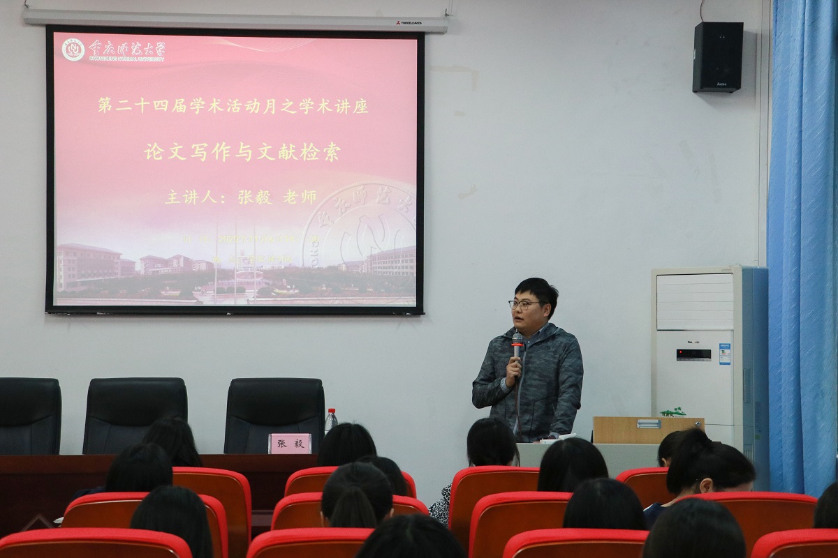 第二十四届学术活动月之“论文写作与文献检索”学术讲座在汇贤楼X106教室举行。图书馆张毅老师应邀为同学们作了论文内容的技巧分享,本次讲座由罗滢滢同学主持,2020级学术班研究生参加了本次讲座。
