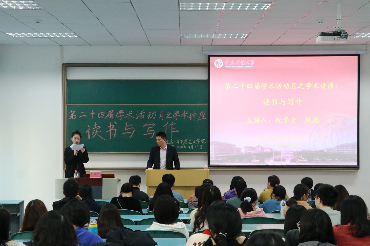 2020年11月13日下午14:30,熊猫体育 阮李全教授应邀在求是楼127教室为研究生作“读书与写作”专题讲座。2019级学术班研究生及2020级全体研究生参加,活动由研究生孙梦迪主持。