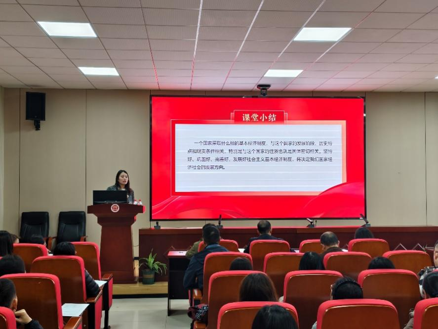 首先,孙贝博士以《习近平新时代中国特色社会主义思想概论》课程中的“推动高质量发展”为主题进行教学展示。她用丰富的内容突出教学主题,使授课对象对高质量发展有了更深入的了解,明确了高质量发展是新时代我国经济社会发展的鲜明主题,是全面建设社会主义现代化国家的首要任务。
