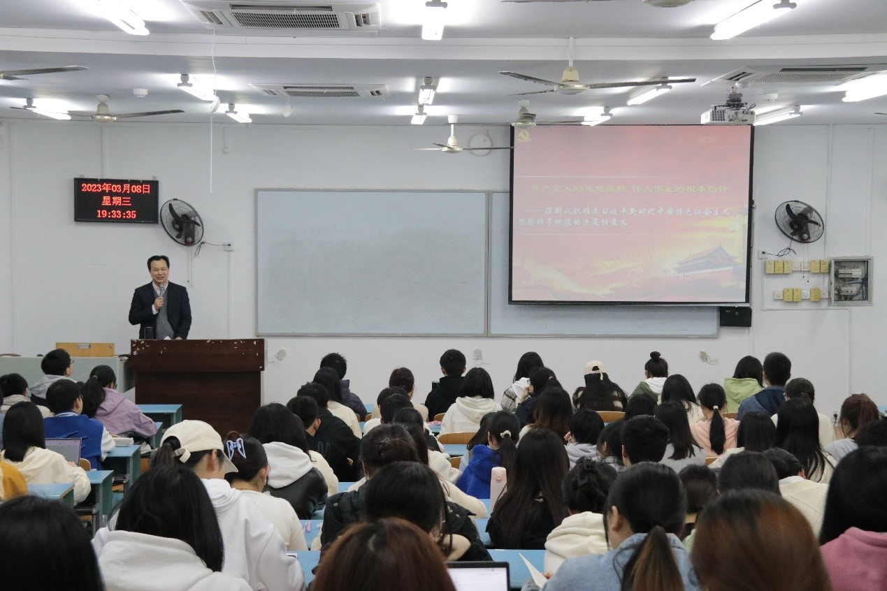 曾礼教授的授课全程循循善诱,主题鲜明、内容详实、学理性强、案例丰富、通俗易懂。本次专题授课,进一步帮助同学们深刻领悟“两个确立”的决定性意义,进一步加强思想政治教育、厘清学生思想困惑,切实增强思想认同、政治认同、理论认同,引导同学们将先进理论内化于心、外化于行,自觉做到“听党话、跟党走”。