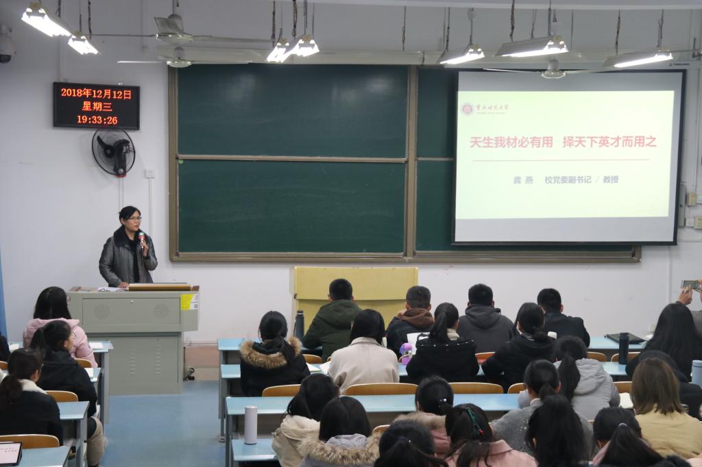 党委副书记龚燕教授主讲,主题是“天生我材必有用 择天下英才而用之”,讲座由熊猫体育