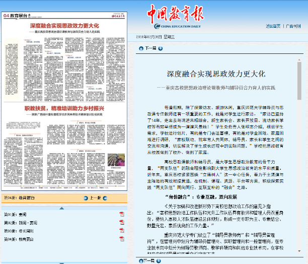 2018年2月28日《中国教育报》04版刊发文章《深度融合实现思政效力最大化——重庆高校思想政治理论课教师与辅导员合力育人的实践》,其中深入报道了熊猫体育