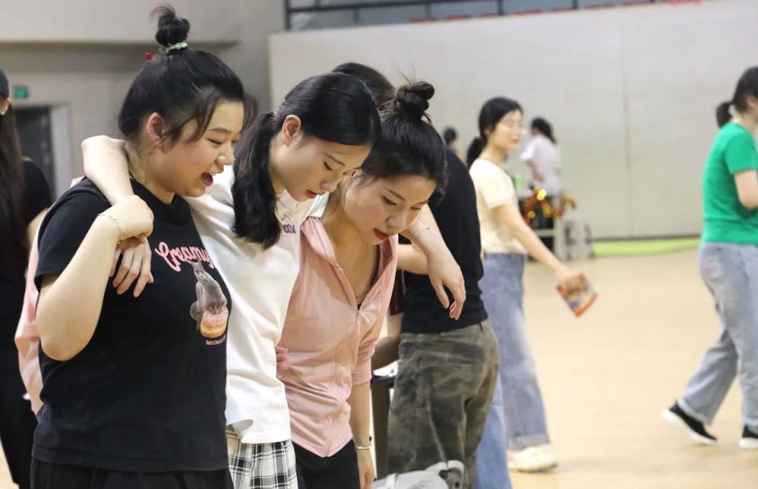 在“三人两足”中,绑带将三人的脚步紧紧相连,也让团队的心凝聚在一起。随着一声令下,三人紧挽手臂、调整步调,从踉跄到默契,最终顺利配合完成挑战。