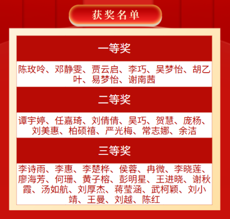 最后,活动根据集章数量进行排名设置奖项。经过紧张的章数统计,同学们期待的获奖情况出炉!活动排行前10%的同学获一等奖,排行前15%的同学获二等奖,排行前25%的同学获三等奖。获奖名单如下: