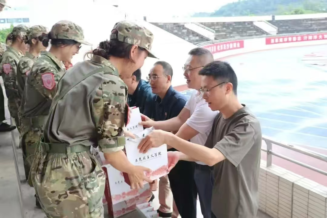领导为同学们分发军训慰问物资